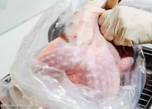 - If Using a Frozen Turkey: The turkey must be fully thawed before you marinate it. A frozen or partially frozen turkey won’t absorb the marinade properly and won’t cook evenly. As a rule of thumb, allow 24 hours of thawing time for every 4–5 pounds of turkey in the refrigerator. For example, a 15-pound turkey usually needs about 3 days in the fridge to thaw completely. Make sure it feels soft all the way to the cavity before you move on to seasoning or marinating.