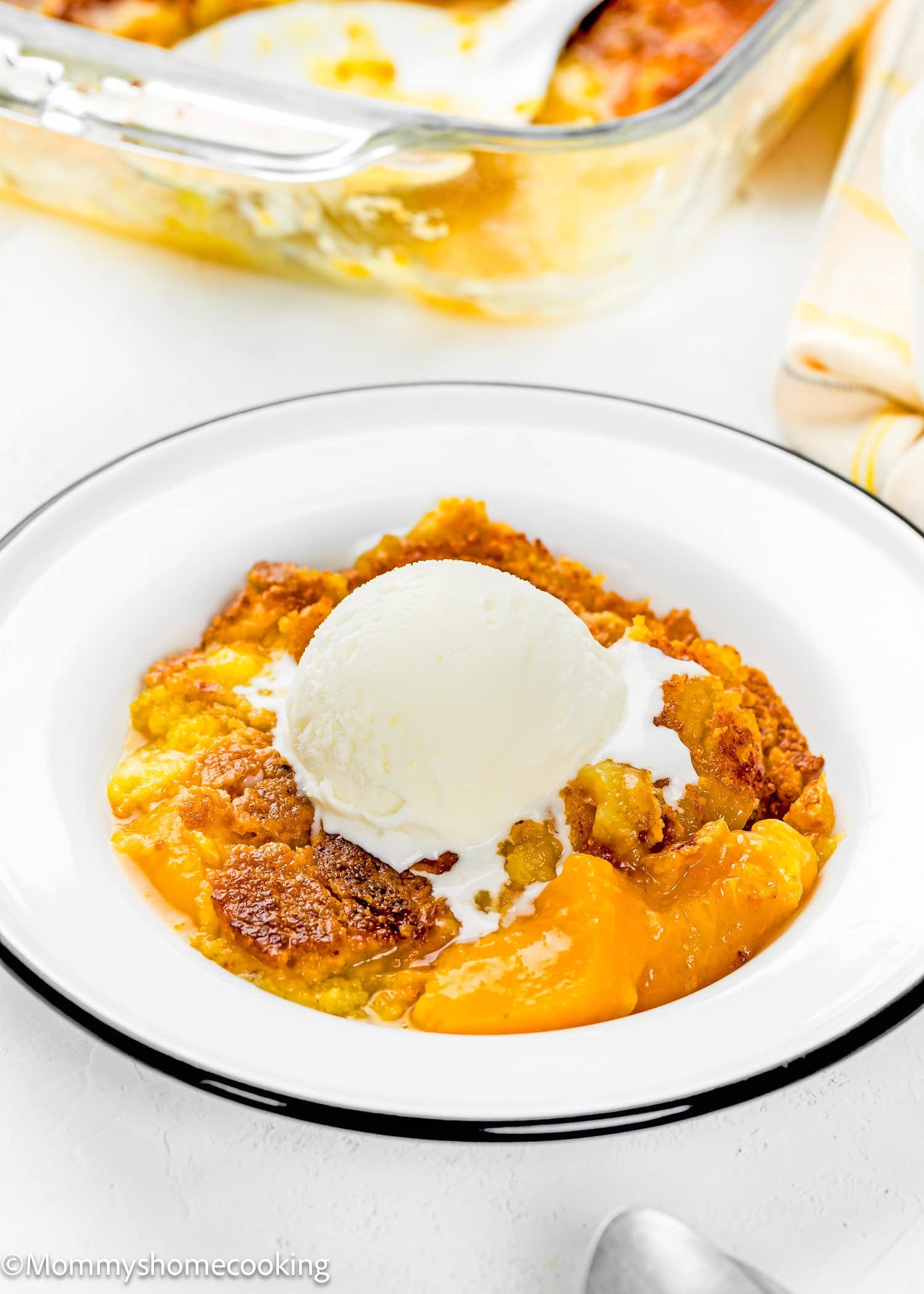 Fresh peaches: You can easily turn this into a recipe with fresh peaches. Peel and slice six to seven fresh peaches. Add them to the baking pan with 1/2 cup granulated sugar (or brown sugar for a touch of molasses flavor) and add ¼ cup of water. Toss to coat, then proceed with the recipe as directed.