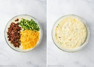 Gently fold in the cheddar cheese, bacon, and green onions if you’re using them. Let the batter rest for 10 minutes.