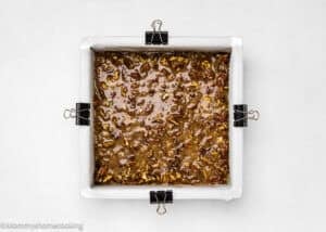 - Line the baking pan with parchment paper so it’s easier to lift out the bars for slicing.