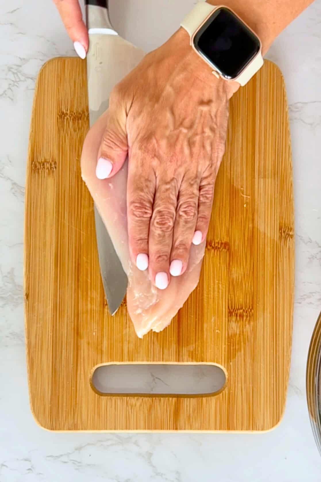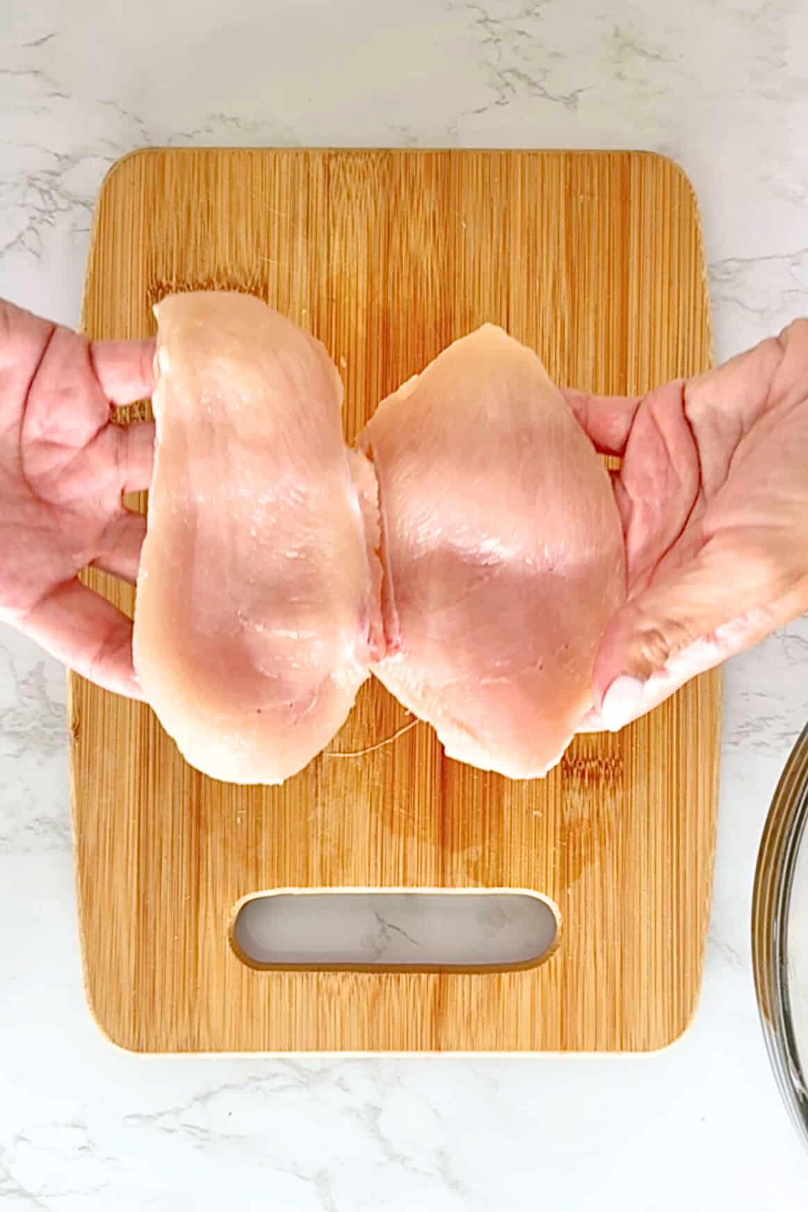 - If you’re starting with regular chicken breasts, you’ll want to slice them into thinner cutlets. Here’s how: place the chicken breast flat on a cutting board and, using a sharp knife, carefully slice it in half horizontally—like you’re butterflying it, but go all the way through so you end up with two thinner pieces.
