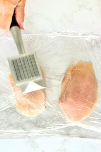 - Pound the chicken to about ½ inch thickness so it cooks evenly and quickly.