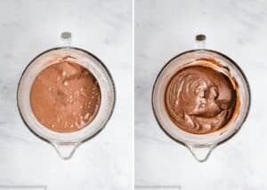 Mix in the cocoa mixture until smooth, then slowly stir in the melted butter until the batter is glossy and silky.