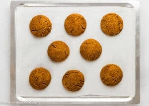Mix the coating sugar and gingerbread spice in a small bowl. Scoop about 1 ½ tablespoons of dough, roll into balls, and coat well in the spiced sugar. Arrange on the baking sheets, leaving 2 inches between each one.