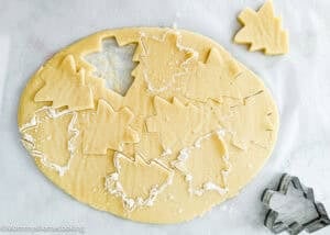 Working with one sheet of dough at a time, use a cookie cutter to cut into tree shapes. Transfer the shapes to the prepared baking sheets, spacing them about 1/2 inch apart.