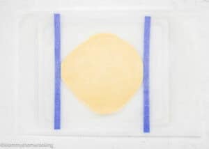 - Place one piece of dough on a big piece of parchment paper (or a silicone mat). Place a piece of parchment on top to prevent sticking. With a rolling pin, roll the dough out to about ½ inch (1.2 cm) thick. Try to shape the dough into a square. Repeat with the second piece of dough.