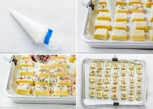 Take out one sheet of dough at a time and cut it into little squares — a pizza cutter makes this super easy. Press the scraps together, shape into a square again, and re-roll if needed. Chill again if the dough starts to warm up. Place your little cookie squares on the prepared baking sheets, giving them a bit of space.