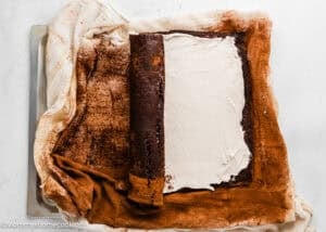 - While the cake bakes, lay a clean, thin cotton kitchen towel on the counter and generously dust it with 1/4 cup cocoa powder.