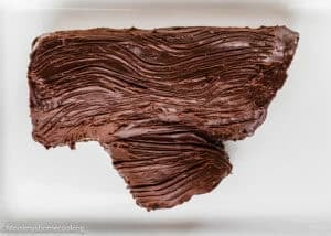 - Slowly spoon the ganache over the cake while smoothing with an offset spatula. You may leave the cut ends exposed or cover them with glaze. Use a fork to create bark-like lines. Wipe any excess ganache from the serving platter.
