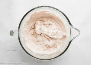 While the cake cools, whip up the cream. Just beat the heavy cream with sugar, vanilla, and a touch of chocolate until it’s nice and fluffy. It should hold soft peaks and feel light, not runny.