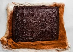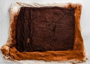 - When the cake is done, run a knife around the edges to loosen it. Invert it immediately onto the cocoa-dusted towel. Carefully peel off the parchment paper.