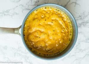 - Slowly pour in half of the hot liquid while whisking. Once the mixture thickens, gradually add the remaining liquid, whisking continuously until smooth.