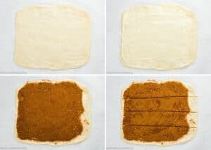 Roll the dough into a rectangle, spread the butter, and sprinkle the cinnamon-sugar. Using a pizza wheel or sharp knife, cut the dough horizontally into 4 even strips (parallel to the short side), so you end up with four long rectangles.