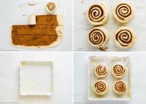 Roll the dough into a rectangle, spread the butter, sprinkle the cinnamon-sugar, and then roll it all up into a tight log. Slice into four big rolls and place them in a small baking dish. They’re already looking cute!